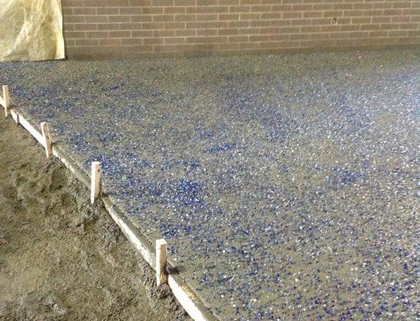 混凝土中加入了大约678,300磅的当地采集的专业骨料,在表面人工抛洒了1/8- 1/4英寸厚度的可循环利用玻璃-其中有2400磅红色、紫色和橘黄色玻璃以及5000磅的蓝色玻璃。