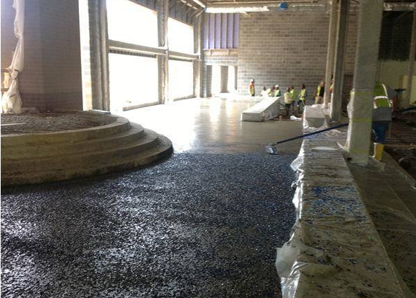 抛光混凝土承包商CuvielloConcrete of Stevensville, Md.公司同设计师和总包方协作制定了一个对抛光工艺很为有利的基层:包含混合搅拌设计,抹面方法,养护方法,切割缝的处理和很后的地面防护。
