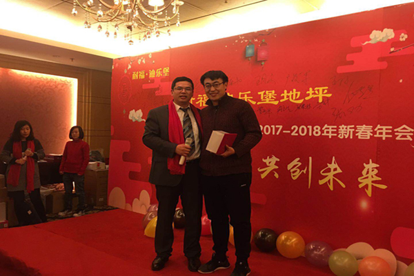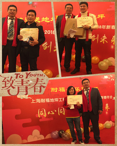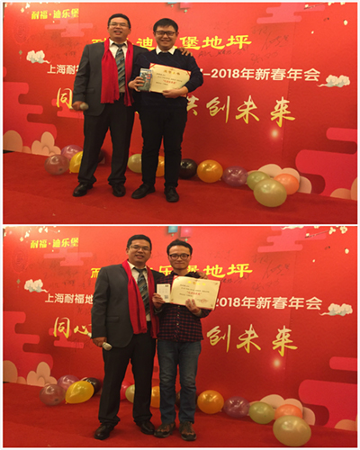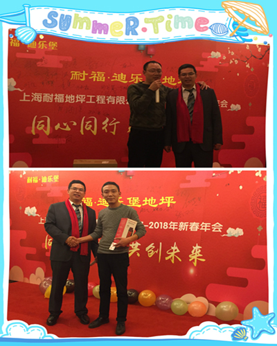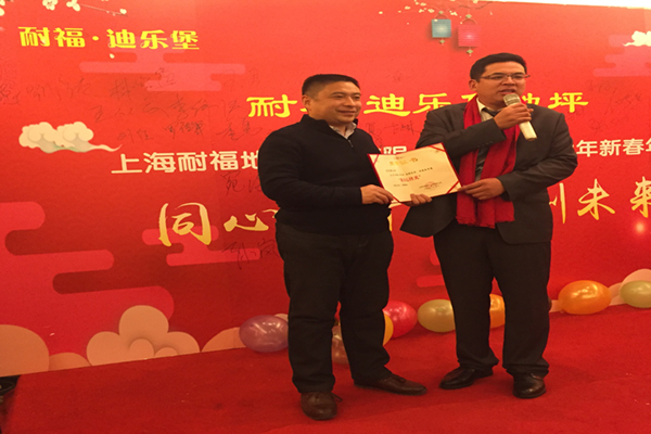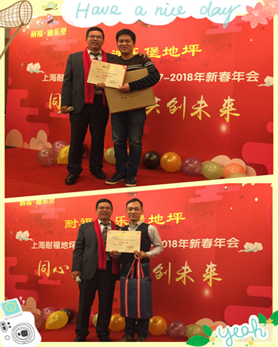 激情开拓奖、很好施工奖和很好支持奖,感谢刘总、罗总和方总平时对我们的大力支持,耐福·迪乐堡地坪的发展离不开你们。其中刘总获得飞利浦电动剃须刀一个,罗总获得小米官方移动电源一个,方总获得蓝牙音箱一个。