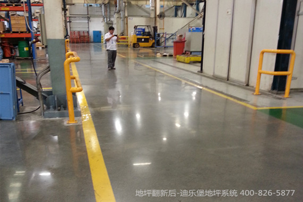 迪乐堡钢化地坪系统选用的混凝土致密钢化剂,无毒、不燃,通过化学反应增强混凝土密实度,深入渗透混凝土地坪内部5-8mm,与水泥中氢氧化钙发生深刻化学反应,达到致密钢化效果。经过迪乐堡钢化地坪系统翻新改造后的车间地面,耐磨性很强(莫氏硬度可以达到7以上),抗水防滑,永远性防尘,具有大理石般光泽。更重要的是旧地面翻新通过迪乐堡钢化地坪改造后,不需要再次翻新、覆盖或打蜡,只需经常性用水清洗!