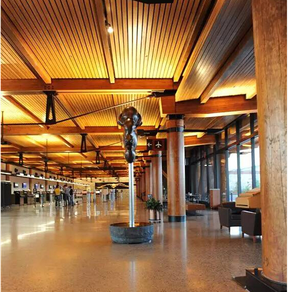 混凝土加入粗骨料鹅软石大面积的处理了登记大厅,与大厅的木质吊顶相得益彰。