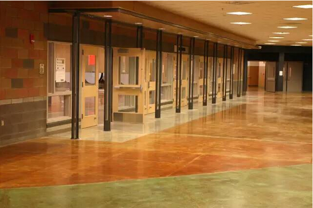 近40,000平方英尺的地面,结合染色,处理了走廊和大厅。学校非常满意地面的感觉,以及易于维护保养,后勤部门认为地面是“他们很好的朋友”。