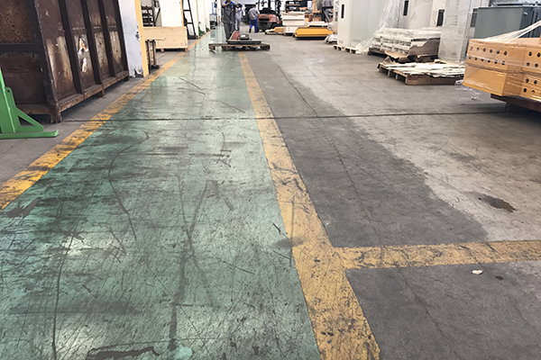 我们的二号厂房,旧地面是环氧和金钢砂地坪,刚完工时是亮丽的绿色表面,但车间里的生产机器都是“重量级大块头”,地面经受不住重载考验,很快就变成了到处破损、退色,污渍遍地难以清洗、到处轮胎印的黑地面,外界各级领导参观访问时严重影响了企业形象!而对于像我这样长期在厂房里工作的员工来说,天天看到这样的黑地面,工作效率和心情都大打折扣!