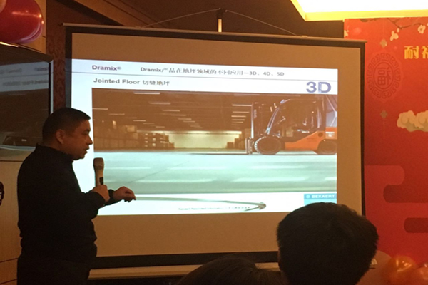 我们为客户提供各方面的地坪系统解决方案,耐福·迪乐堡地坪系统在专注于力石伯乐和安斯福妙乐密封固化硬化剂推广的同时更专注于地坪基础的抗裂设计,导入世界500强企业贝卡尔特公司的3D4D5D钢纤维产品,解决了客户的地平开裂的问题。台下听得非常认真,目不转睛的盯着屏幕。