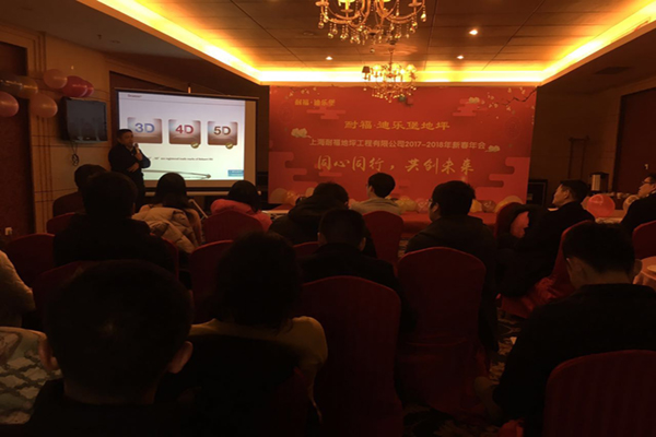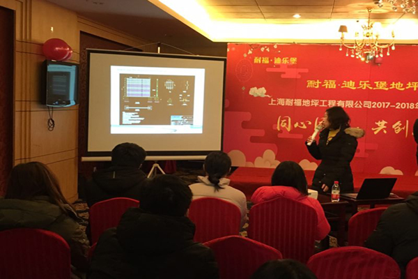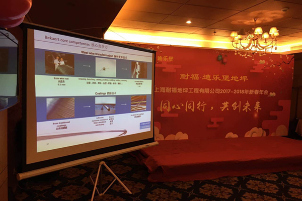 贝卡尔特应用材料科技(上海)有限公司 佳密克丝钢纤维大客户经理 方永森先生在为大家讲解佳密克丝钢纤维在地坪领域的应用,大家受益匪浅!培训从上午9:00一直持续到下午17:00,这8个小时内大家都在认真学习,用知识来武装自己的大脑,塑造更好的自己。培训大会结束后,王总和大家合影留念,预祝耐福·迪乐堡地坪2018年会更好!狗年吉祥!一年更比一年旺!