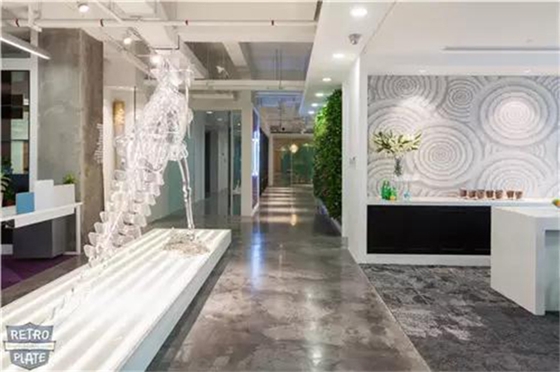 经过迪乐堡地坪系统的处理后,办公室地面会变得更加耐磨和坚固,因为在处理过程中地面上的毛孔被有效封堵了,地面的拒水性和抗渗性有了提升,再加上固化剂渗入地面内部5-8mm,地面的莫氏硬度升到了7-8,相比其他地面装修材料,使用寿命更长。那么不仅地面的保质期可以提升至10年以上,更重要的是绿色环保。迪乐堡地坪无毒阻燃,具有A级防火标准和全球第三方权威检测机构的报告,清洁工作变得更加方便,无需花费大量人力物力,还节省了翻新成本,提升了企业形象,更好的呈现企业文化。虽然迪乐堡钢化地坪是用混凝土制作的地坪,但绝对不像普通混凝土那般单调。在优秀设计师的眼里,混凝土也是可以被设计的,经过适当的处理后,再加上鬼斧神工的设计,将您的办公室打造成为艺术殿堂!办公室地面变得高端时尚,业主的企业形象也随之上升,再加上维护成本低、实用耐用等优势,若是在这样一个轻松的环境里办公,工作效率也会大大提高,为企业带来收益!