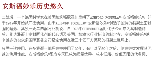 来自美国的ASHFORD FORMULA–安斯福妙乐混凝土密封固化剂,是一种无色、无味、无毒的液体密封剂,通过有效渗透(5-8mm),ASHFORDFORMULA–安斯福妙乐与混凝土中的化学成分发生深刻化学反应,使其成分固化成一个坚实固体,从而得到一个无尘、致密的整体,有效的提高了密度、强度、耐磨性。因此安斯福妙乐混凝土密封固化剂又被叫做水泥地面硬化剂,混凝土液体固化剂,渗透密封剂,渗透硬化剂,地面起砂处理剂等等。