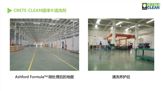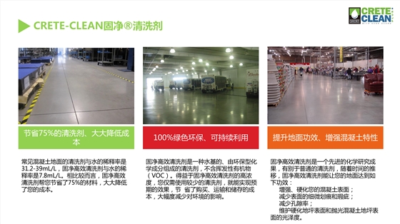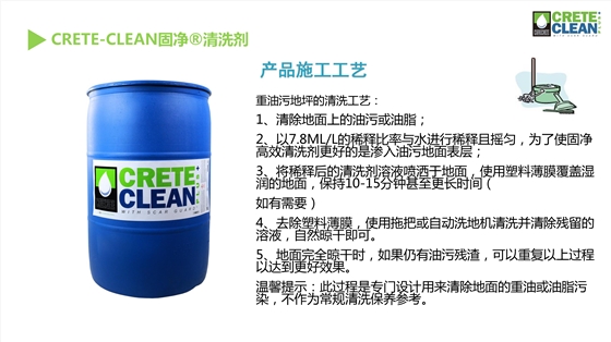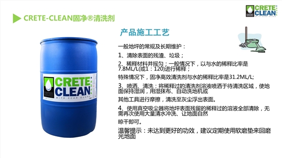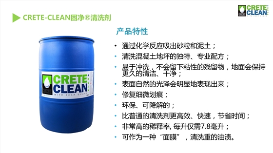 CreteCleanPluswithScarGuard--固净效率高地坪清洗剂是用来清洁硬化混凝土地面和抛光混凝土地面的专业清洗剂,其专有的磁极技术将污染物“拉”出混凝土表面、刑场悬浮液,使污染物变得易于清洗。与很多常见清洗剂相比,固净效率高清洗剂是一种水基的、不含挥发性有机物,不会破坏混凝土地面自身的防御能力。另外,固净效率高清洗剂免洗技术将避免留下泡沫吸附更多油渍的隐患。