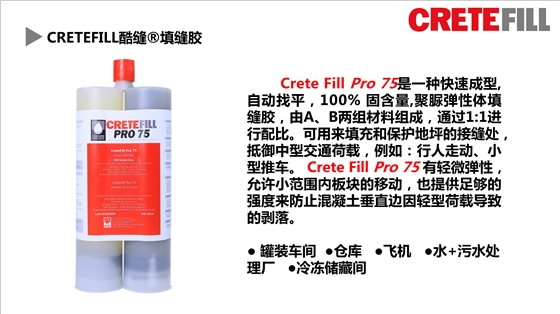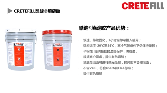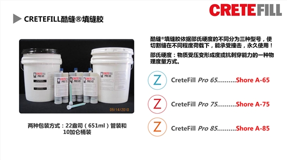 CreteFill酷缝聚脲填缝胶是为带有偏低热循环的混凝土研发的。为您量身定制根据邵氏硬度的不同分为:Pro65、Pro75和Pro85,以满足地坪的不同的需求,使切割缝在不同程度荷载下,能承受撞击,永远使用!