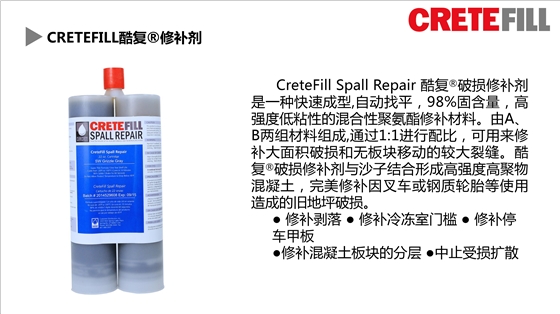 CreteFill酷复修补剂是一种快速成型、高强度的低粘性混合性聚氨酯修补材料。由A\B两组材料组成,1:1配比系统98%固含量,用于修补地坪表面的毛细裂纹,还可以用于快速地修补破损切割缝。