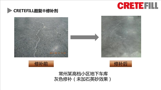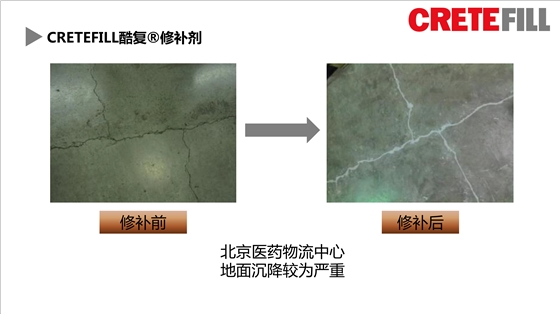 CreteFill酷复修补剂曾经被应用于许多场所的地坪裂缝修补,并且得到了客户们的一致好评!应用案例:北京医药品流核心和常州某高档小区地下车库。