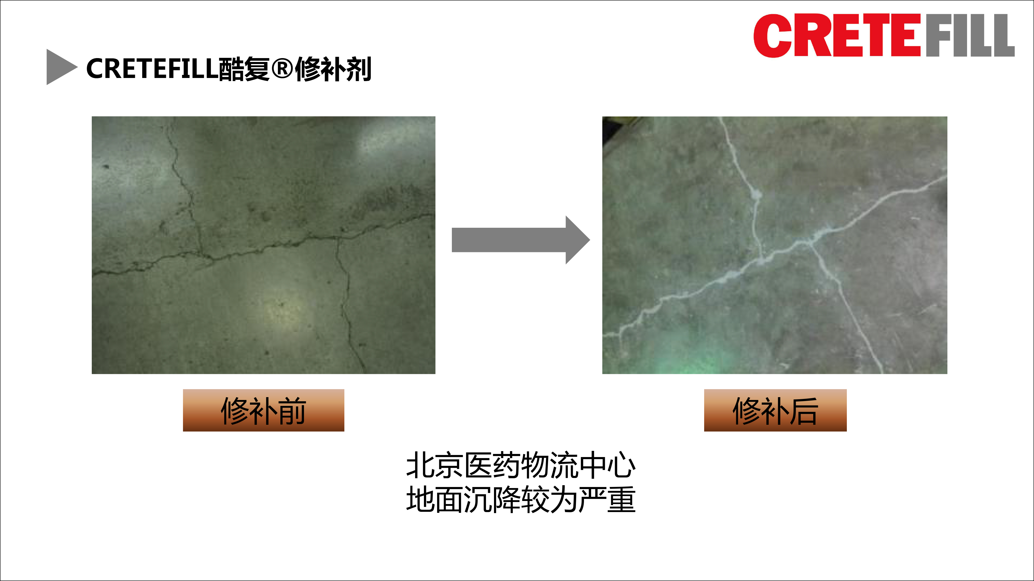 CreteFill酷复修补剂曾经被应用于许多场所的地坪裂缝修补,并且得到了客户们的一致好评!应用案例:北京医药品流核心和常州某高档小区地下车库。
